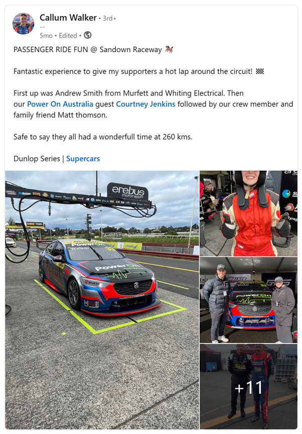 Super Fun weekend and ride for one of lucky customers - Courtney Jenkins - at Sandown this weekend. As part of the pit crew she had first hand exposure to her dream. We are happy that we could give her experience through our sponsorship of Callum Walker and the Walker Racing Team.